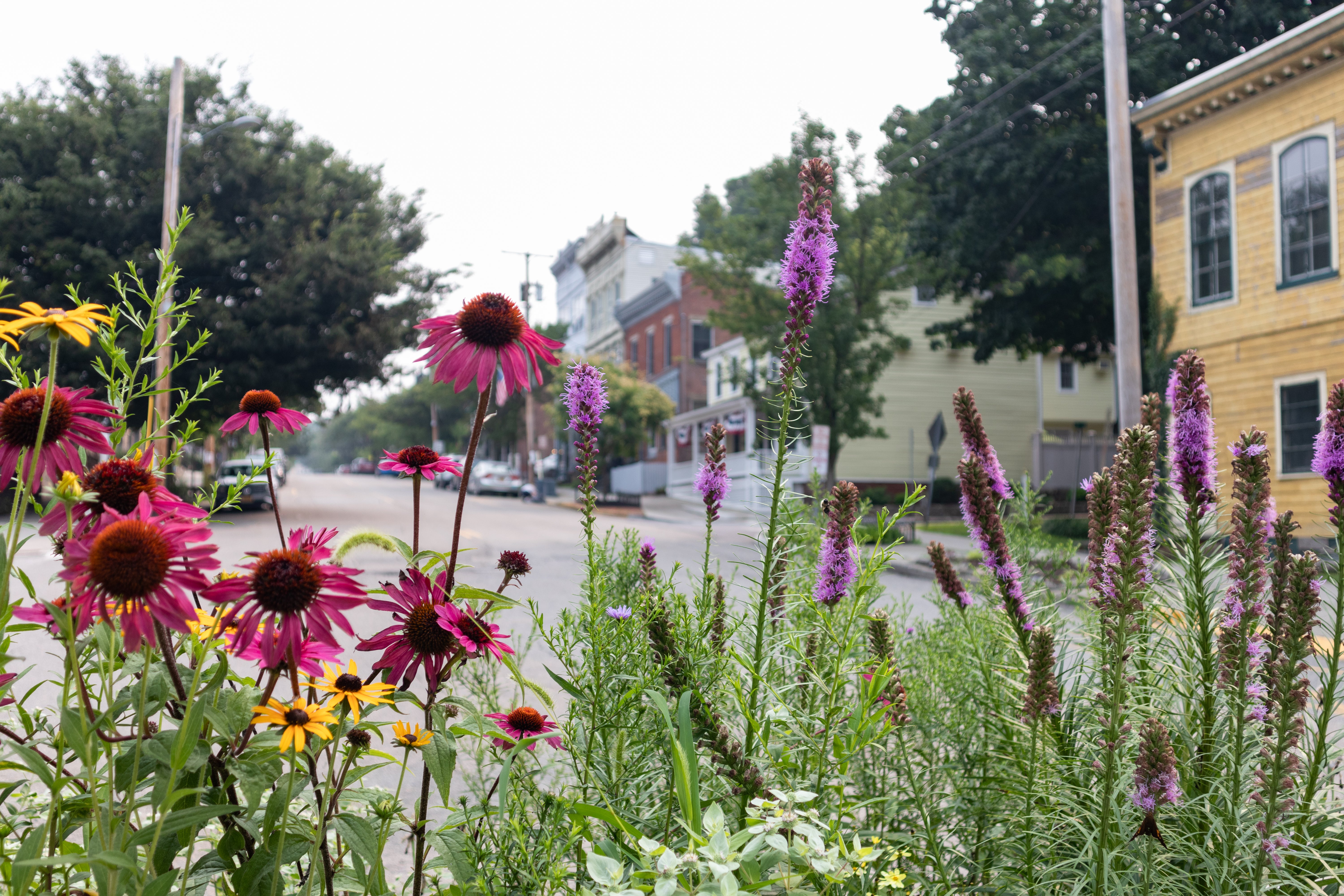 The mix creates colorful seasonal displays — from the magenta Purple Coneflower to golden Coreopsis and Black-eyed Susan — transforming vacant lots, rooftops, and park edges into living art. -